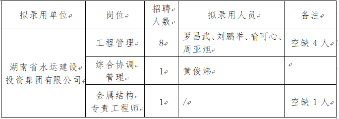 湖南省水运建设投资集团有限公司于2022年6月面向社会进行了公开招聘,经个人报名、资格审查、面试、考察、公司党委研究等一系列程序,拟录用以下5人,现予以公示。
